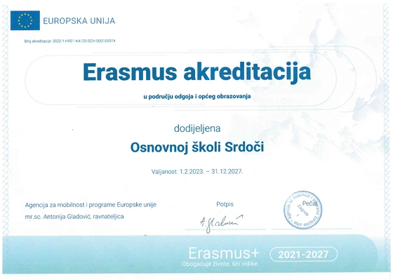 Od 2023.godine Osnovna škola Srdoči je nositelj Erasmus akreditacije, kao jedna od tri riječke osnovne škole. Naša škola će kroz Erasmus akreditaciju imati stalan pristup bespovratnom financiranju mobilnosti osoblja i učenika u sve europske države. Riječ je o programu koji znatno olakšava put prema dobivanju financijske potpore jer je ona već zagarantirana. Tijekom sljedeće četiri i pol godine naša škola će ostvarivati svoje dugoročne ciljeve kroz grupne ili pojedinačne mobilnosti nastavnog i nenastavnog osoblja i učenika. Ovo je prilika za rast i istraživanje europskih partnera, usvajanje novih demokratskih vrijednosti u sklopu multikulturalnosti, ali i usvajanje novih praktičnih znanja u obliku raznovrsnih metoda učenja i poučavanja.