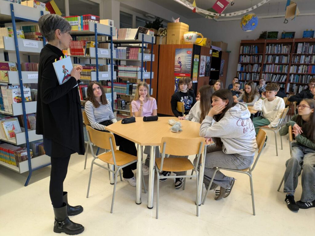 Ususret ovogodišnjem Danu materinskog jezika (21. veljače), nakon dvije godine stanke, u našoj smo školskoj knjižnici, po treći put, 16. veljače ponovno ugostili dr.sc. Teu Perinčić i Mićega Princa, općepoznati Exuperyjev klasik koji je ona, zajedno s nizom svojih suradnika maestralno prevela na materinski jezik ovoga kraja – čakavski!