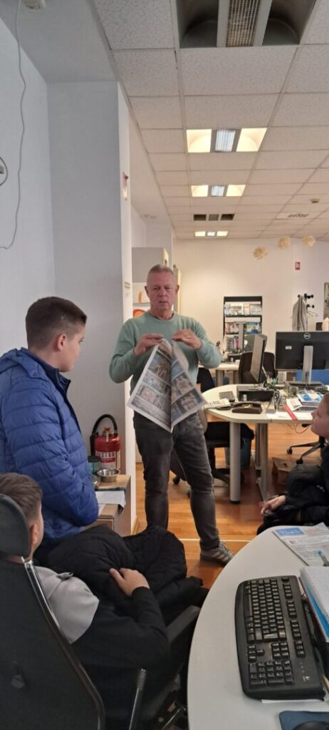 U dvosatnom druženju s poznatim riječkim novinarom Edijem Prodanom, naši su učenici saznali na koji način vijest nastaje, tko su novinari na terenu, a tko urednici i lektori te tko je zaslužan za vizualni identitet riječkih novina utemeljenih davne 1900. godine u čijoj tiskari nastaju novine od Zadra do Savudrije (kako nam je g. Prodan rekao, tiskaju se četiri naslova novina – Novi list, Zadarski list, Glas Istre i La voce del popolo).
