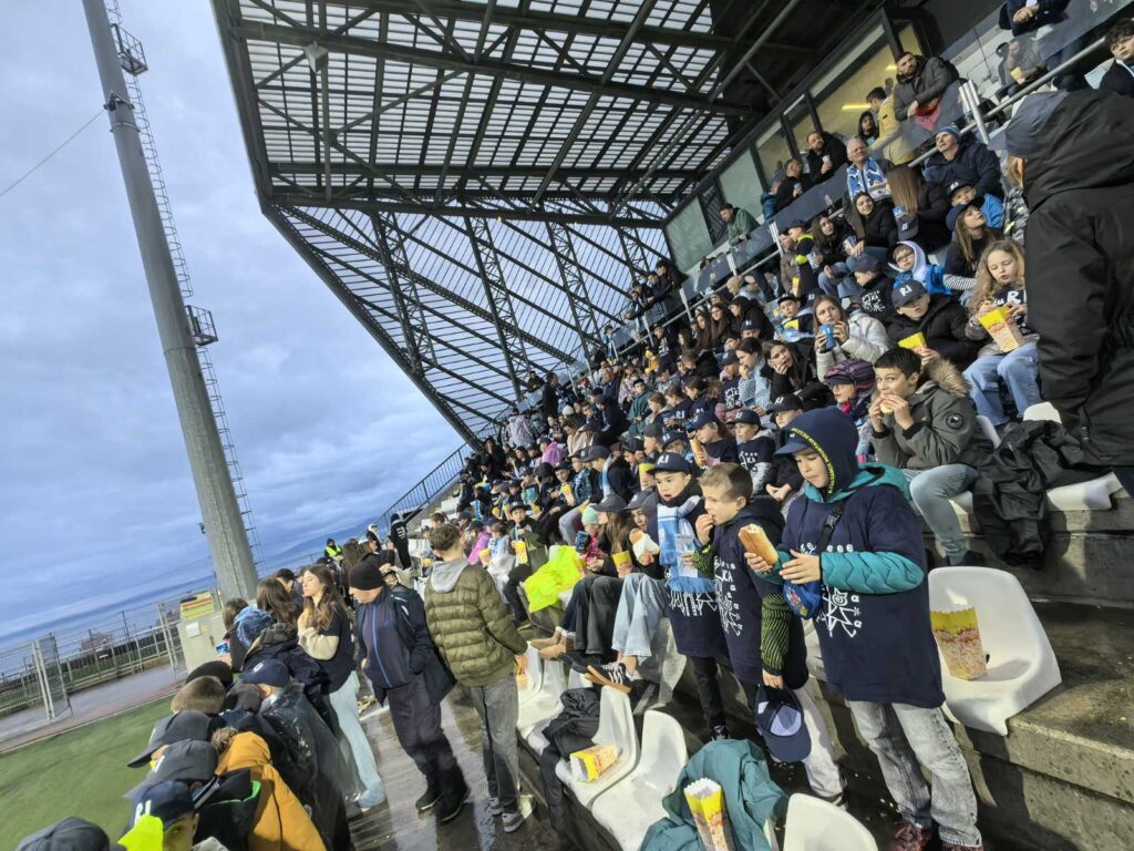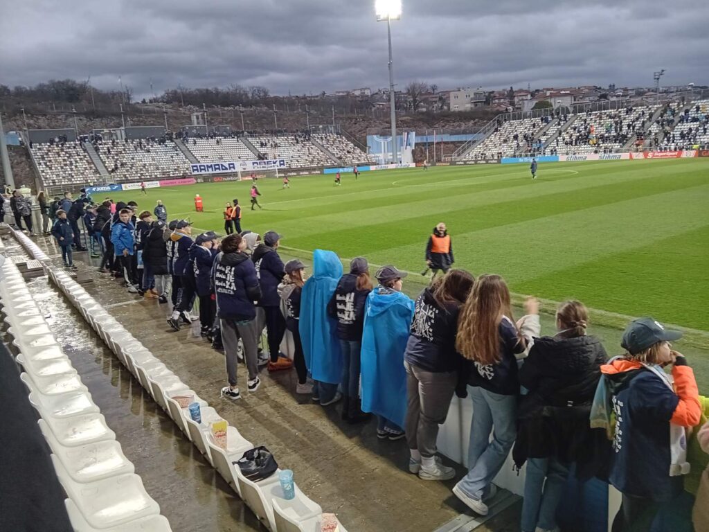 U skladu s najavom, u subotu 14. veljače, unatoč lošim vremenskim uvjetima, više od 250 prijavljenih Srdočkih školana zdušno je s tribina stadiona na Rujevici bodrilo igrače svoga najdražeg kluba.