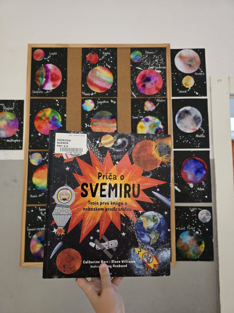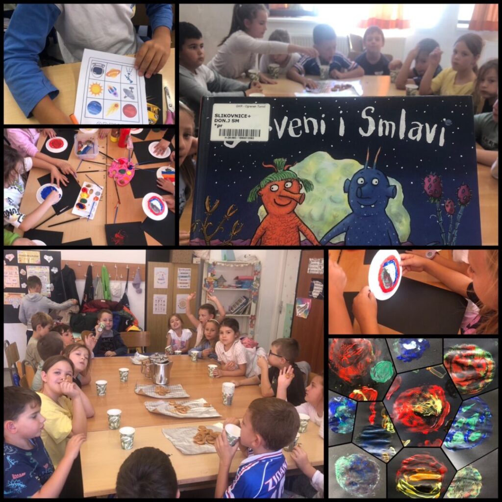 Nakon čitanja priče, uz čaj i kekse, učenici su razgovarali o pročitanome, uspoređivali likove i poruke iz priče te zaigrali svemirski bingo. U kreativnom dijelu temperama su bojali papirnate tanjure koje su otisnuli na papir i tako stvorili svoje šarene planete.