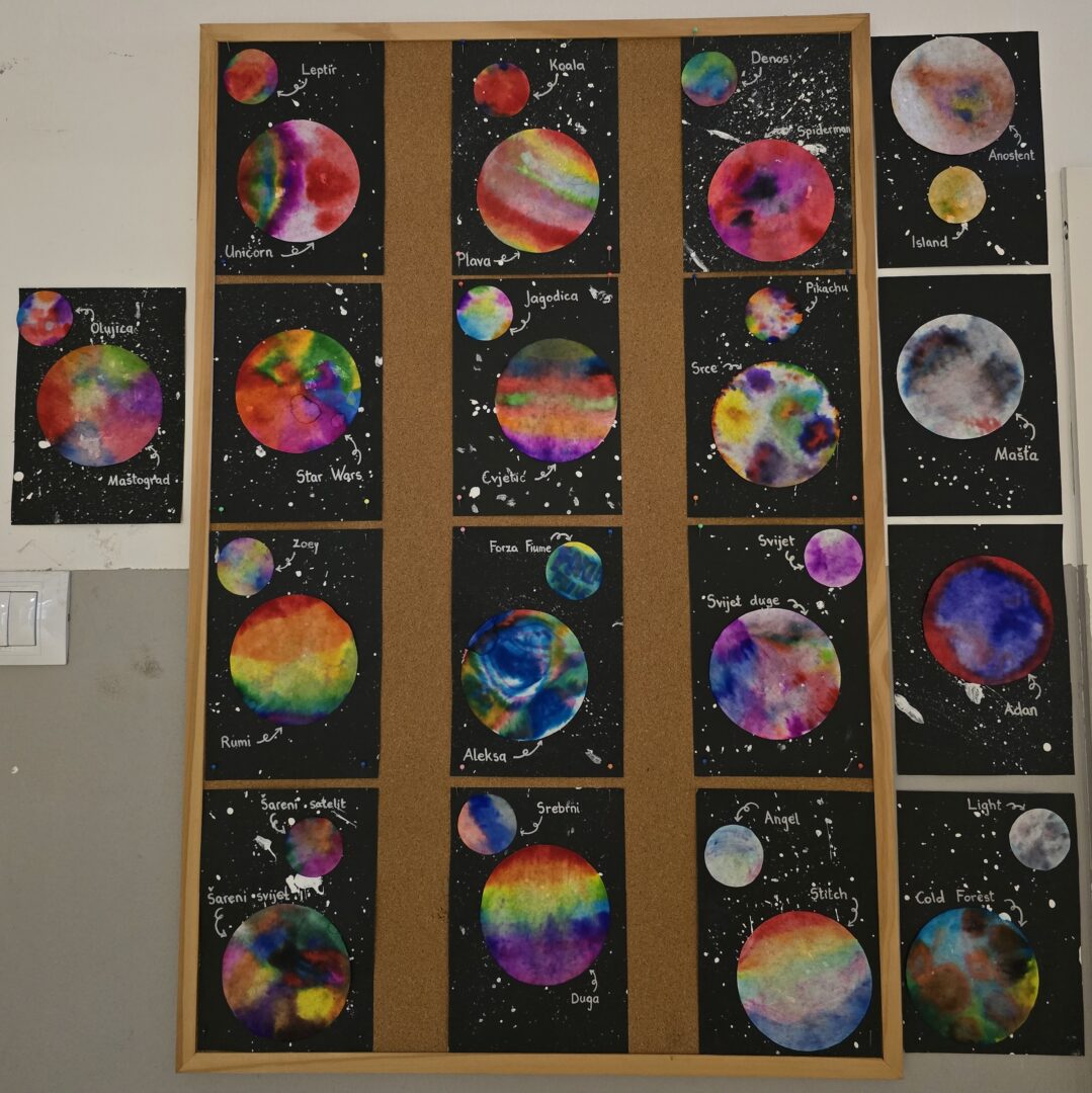 Tjedan svemira završili su likovnom radionicom na kojoj su pomoću filtera za kavu, flomastera i malo vode napravili planete na kojima bi voljeli živjeti jednoga dana te pripadajuće im satelite. Osmislili su im zanimljive nazive te ih izložili ispred svoje učionice.