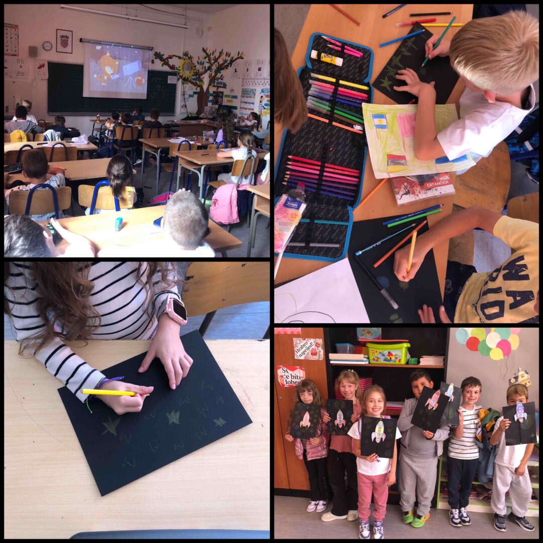 Povodom Tjedna svemira, učenici 1.c i 1.d razreda sa svojom učiteljicom Petrom Skočić proveli su niz zanimljivih i kreativnih aktivnosti kojima su otkrivali tajne beskrajnog svemira. Kroz igru, istraživanje i likovno stvaralaštvo upoznali su planete, zvijezde i rakete te razvijali maštu i znatiželju.