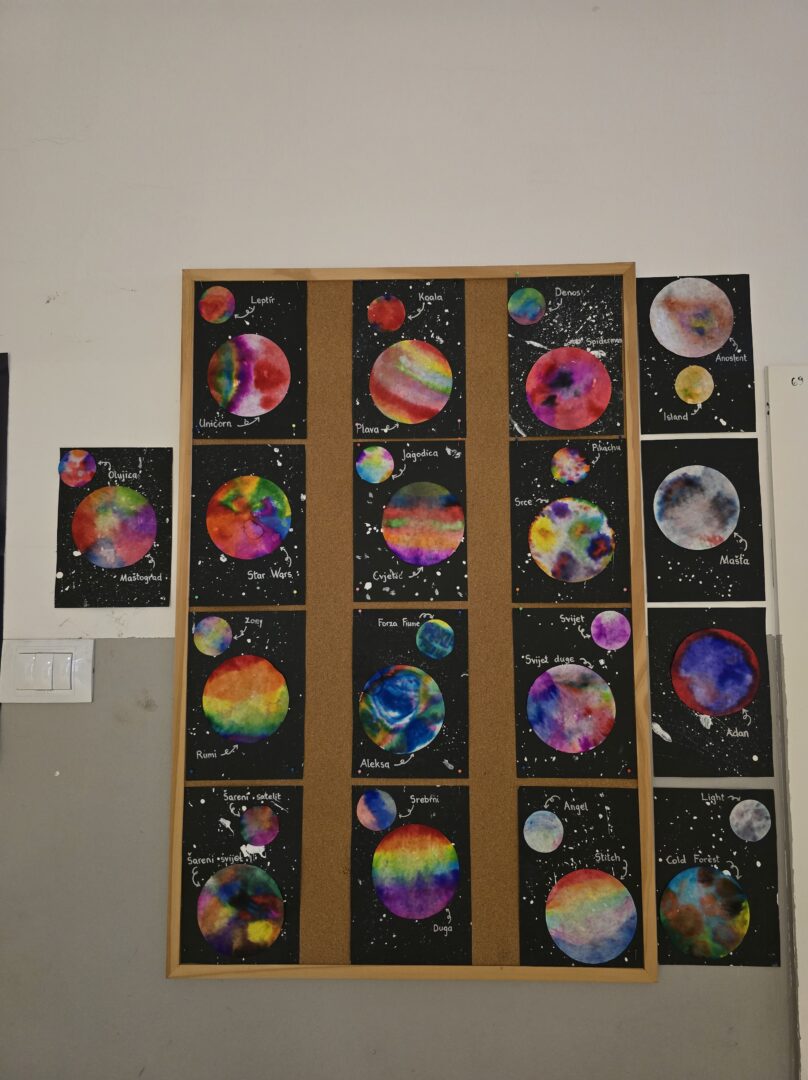 Tjedan svemira završili su likovnom radionicom na kojoj su pomoću filtera za kavu, flomastera i malo vode napravili planete na kojima bi voljeli živjeti jednoga dana te pripadajuće im satelite. Osmislili su im zanimljive nazive te ih izložili ispred svoje učionice.