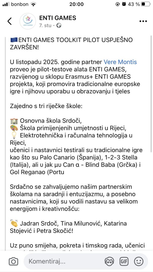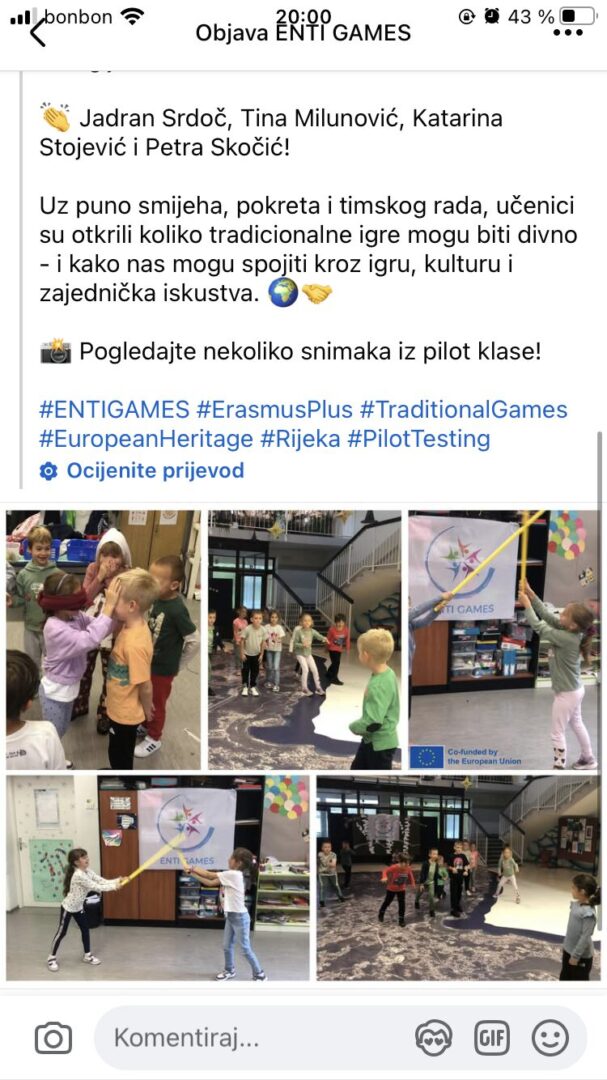 Naša učiteljica produženog boravka, Petra Skočić, uključena je u projekt ENTI GAMES (https://www.entigames.eu/), usmjeren na razvoj priručnika za očuvanje i promicanje tradicionalnih sportova i igara (TSG). Projekt se temelji na preporukama iz izvješća “A Mapping of Traditional Sports and Games in Europe” koje je izradila Glavna uprava za obrazovanje i kulturu Europske komisije.